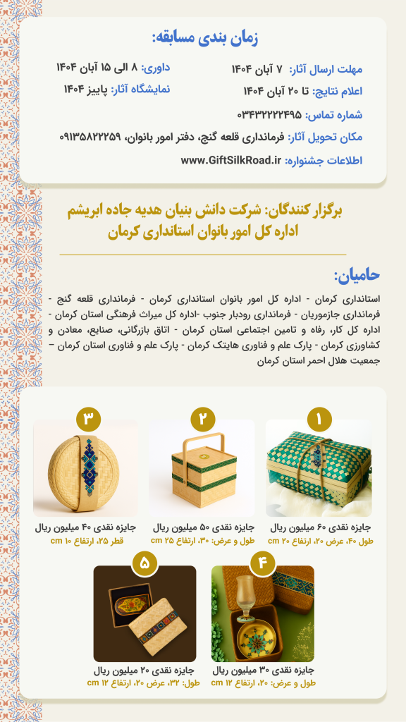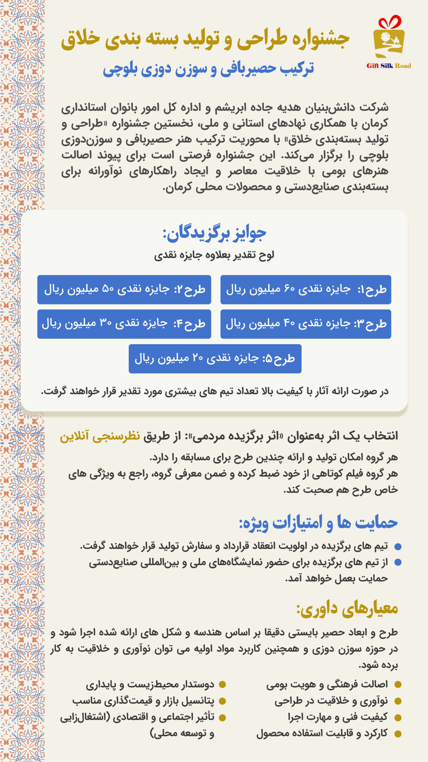 شرکت دانش بنیان هدیه جاده ابریشم با همکاری نهادهای استانی و ملی، نخستین جشنواره «طراحی و تولید بسته بندی خلاق» با محوریت ترکیب هنر حصیربافی و سوزندوزی بلوچی را برگزار میکند. این جشنواره فرصتی است برای پیوند اصالت هنرهای بومی با خلاقیت معاصر و ایجاد راهکارهای نوآورانه برای بسته بندی صنایع دستی و محصولات محلی کرمان.
